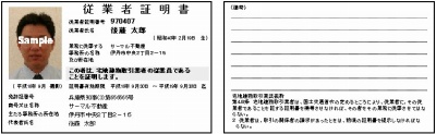 1、従業者台帳の詳細画面内で、従業者証明書の画像をクリックすると印刷できます。(A4の縦) 2、印刷した紙を適当な大きさに切り、社印を押印しラミネーターなどでカードにして完了。 |
